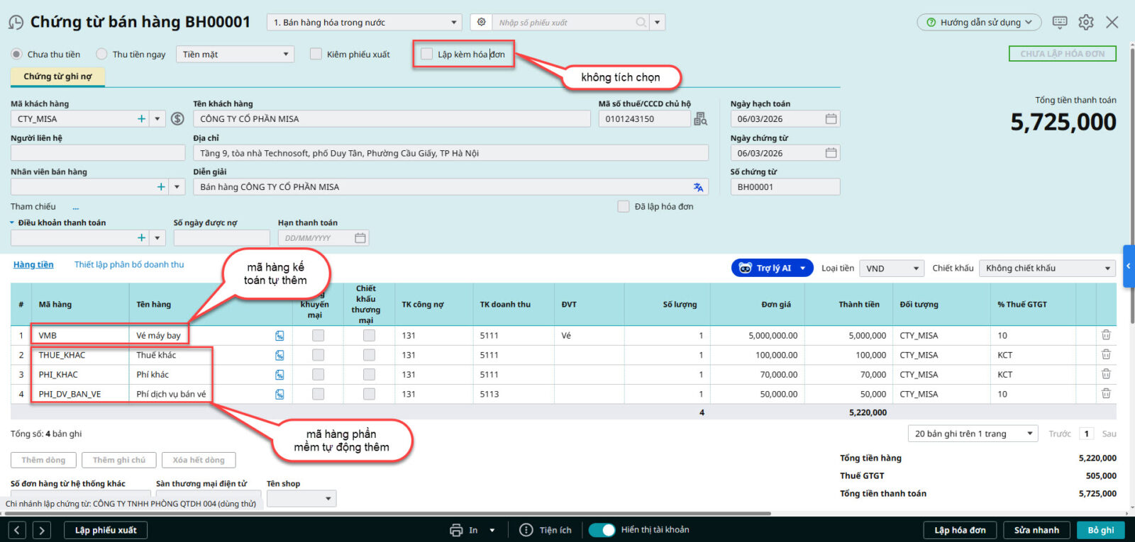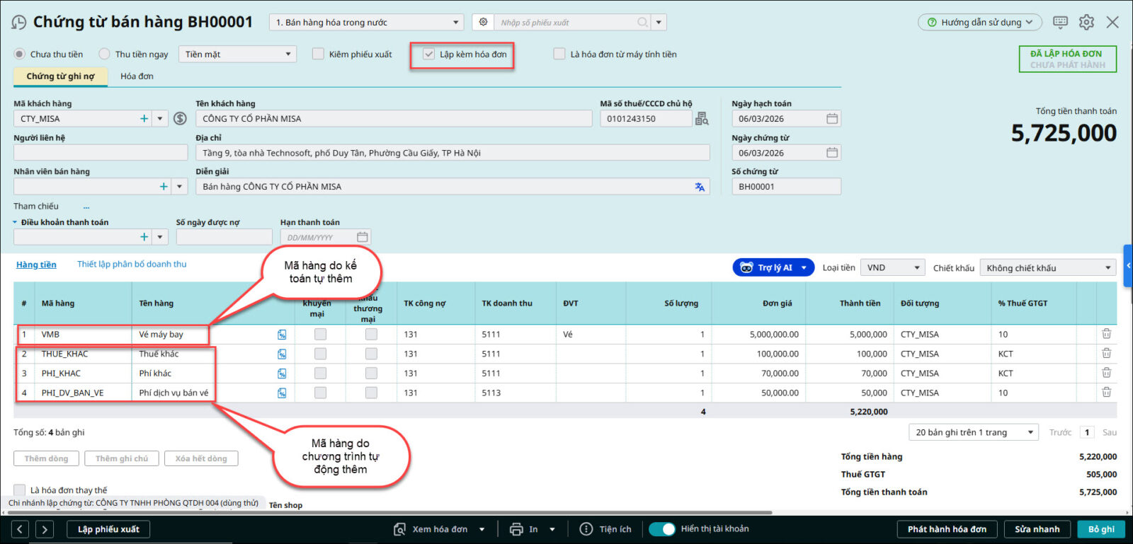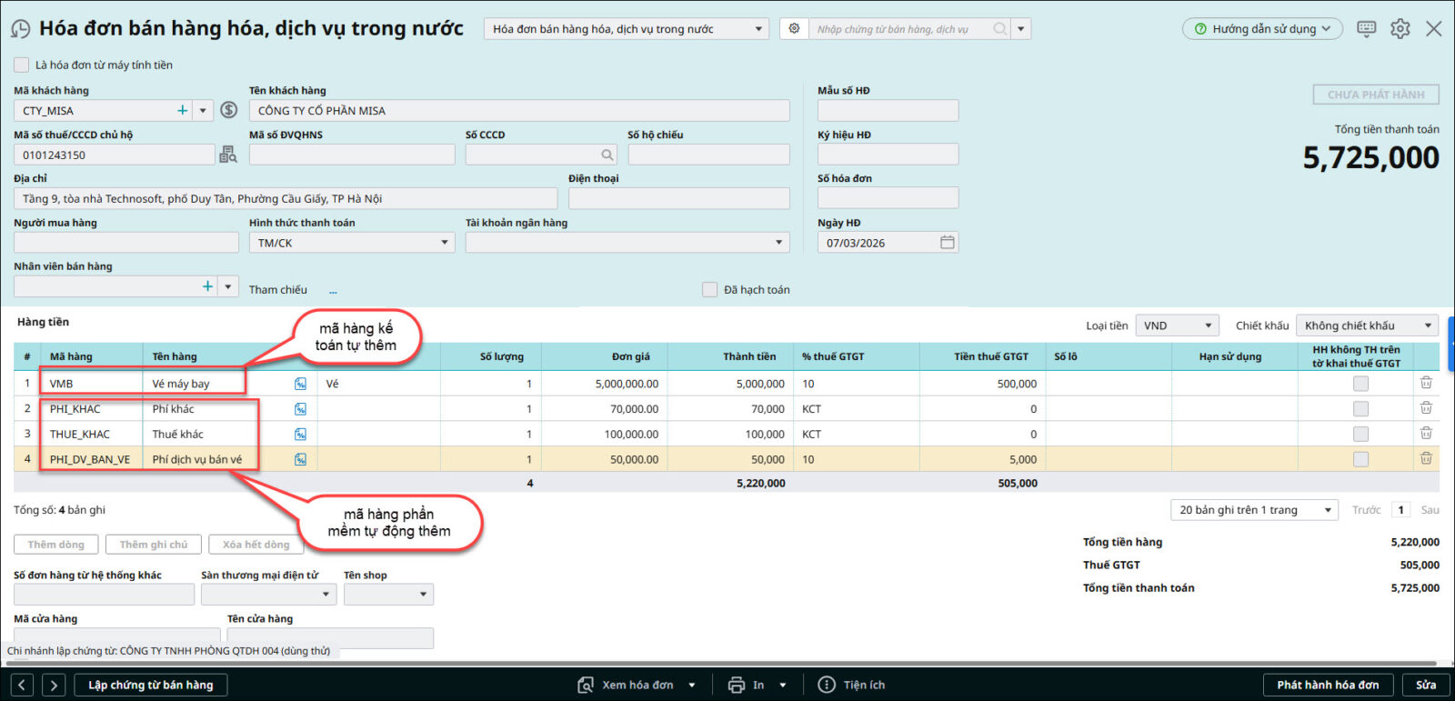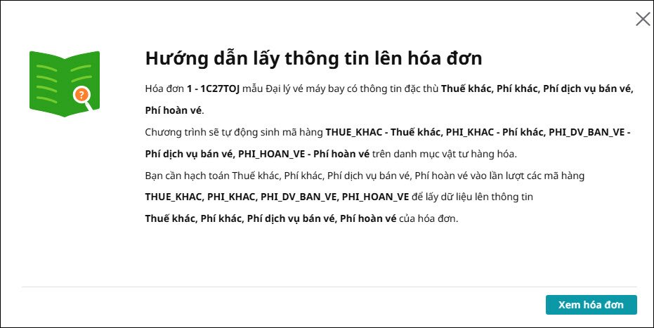 => Khi đó chương trình sẽ tự động thêm vào danh mục Vật tư hàng hóa các mã hàng sau (nếu chưa có trong danh mục) gồm: THUE_KHAC – Thuế khác, PHI_KHAC – Phí khác, PHI_DV_BAN_VE – Phí dịch vụ bán vé, PHI_HOAN_VE – Phí hoàn vé Lưu ý: