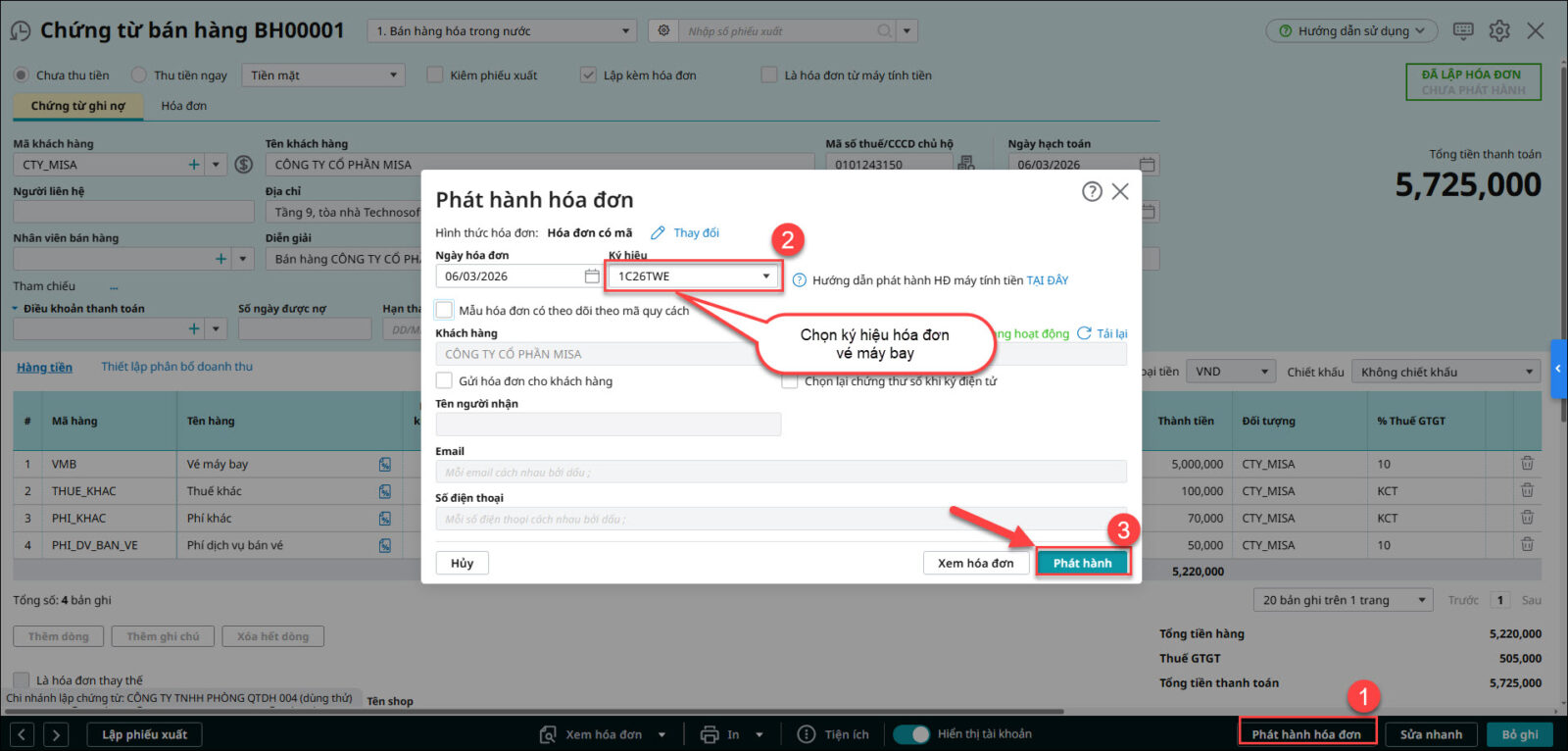 Bước 6: Ấn Cất hóa đơn rồi ấn nút Phát hành Hóa đơn. Thực hiện phát hành hóa đơn như bình thường theo hướng dẫn tại đây 2.3 Lập hóa đơn Đại lý vé máy bay trước, chứng từ bán hàng sauBước 1: Khởi tạo mẫu hóa đơn Đại lý vé máy bay từ bộ mẫu có sẵn trên meInvoice Web