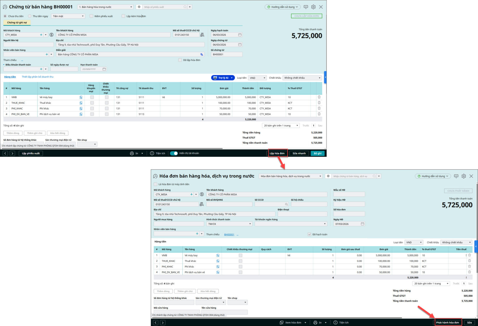 Bước 5: Sau khi nhập liệu chứng từ bán hàng xong, ấn Cất rồi ấn Lập Hóa đơn. Hệ thống sẽ kế thừa dữ liệu đã nhập ở chứng từ bán hàng sang hóa đơn