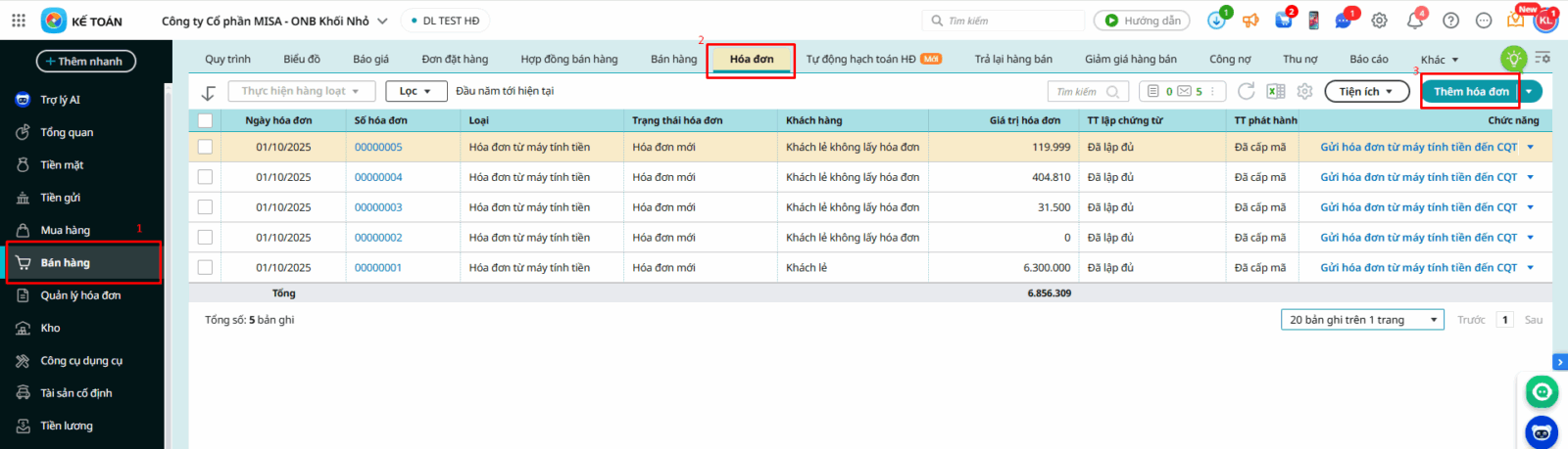 Bước 1: Vào phân hệ Bán hàng, chọn tab Hóa đơn, nhấn Thêm hóa đơn.