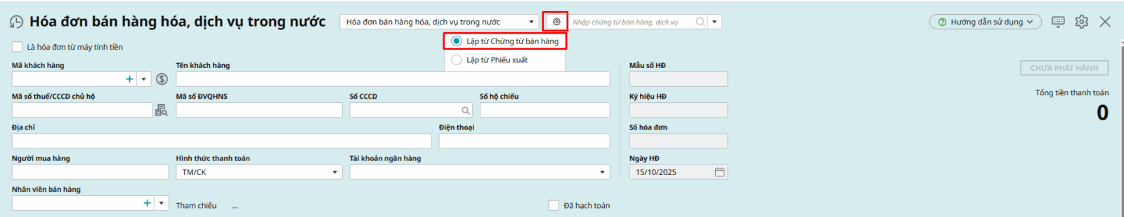 Bước 2: Nhấn vào biểu tượng hình bánh răng ở giữa, chọn Lập từ chứng từ bán hàng.