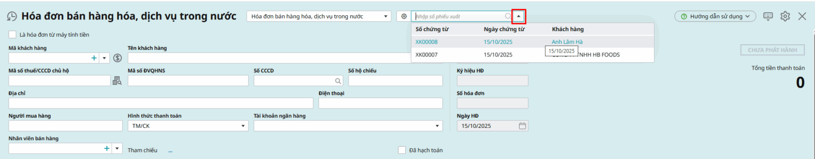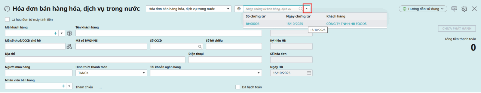• Cách 1: Nhấn vào biểu tượng mũi tên để chọn chứng từ bán hàng trong danh sách.