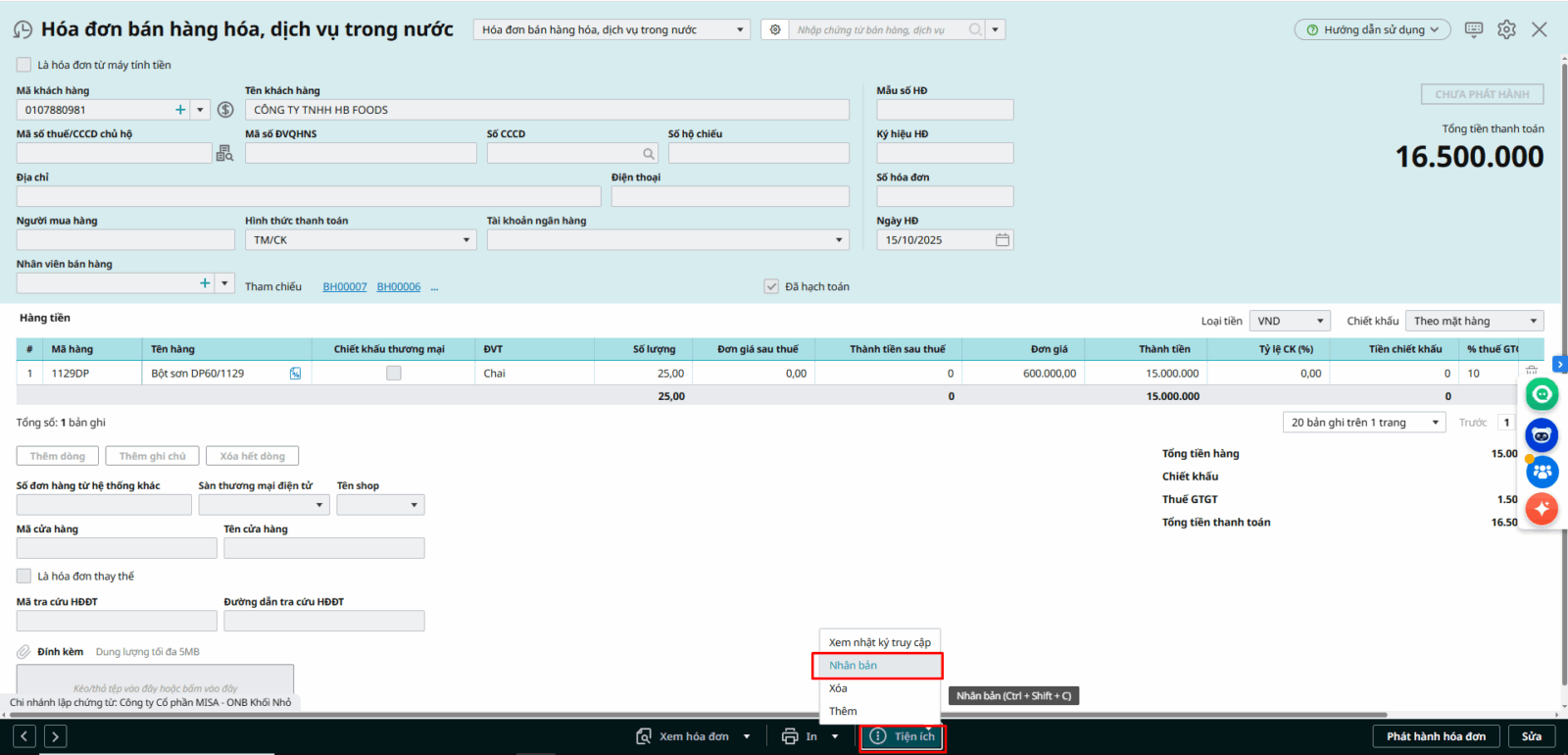 Khi cần tạo một hóa đơn mới tương tự một hóa đơn đã có, cần thực hiện theo các bước sau: