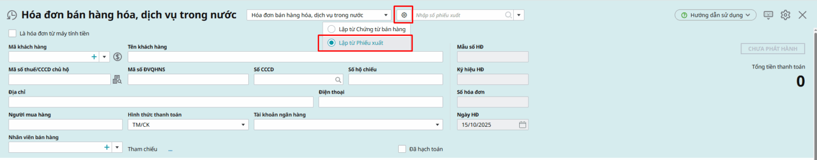 Bước 2: Nhấn vào biểu tượng hình bánh răng ở giữa, chọn Lập từ Phiếu xuất.
