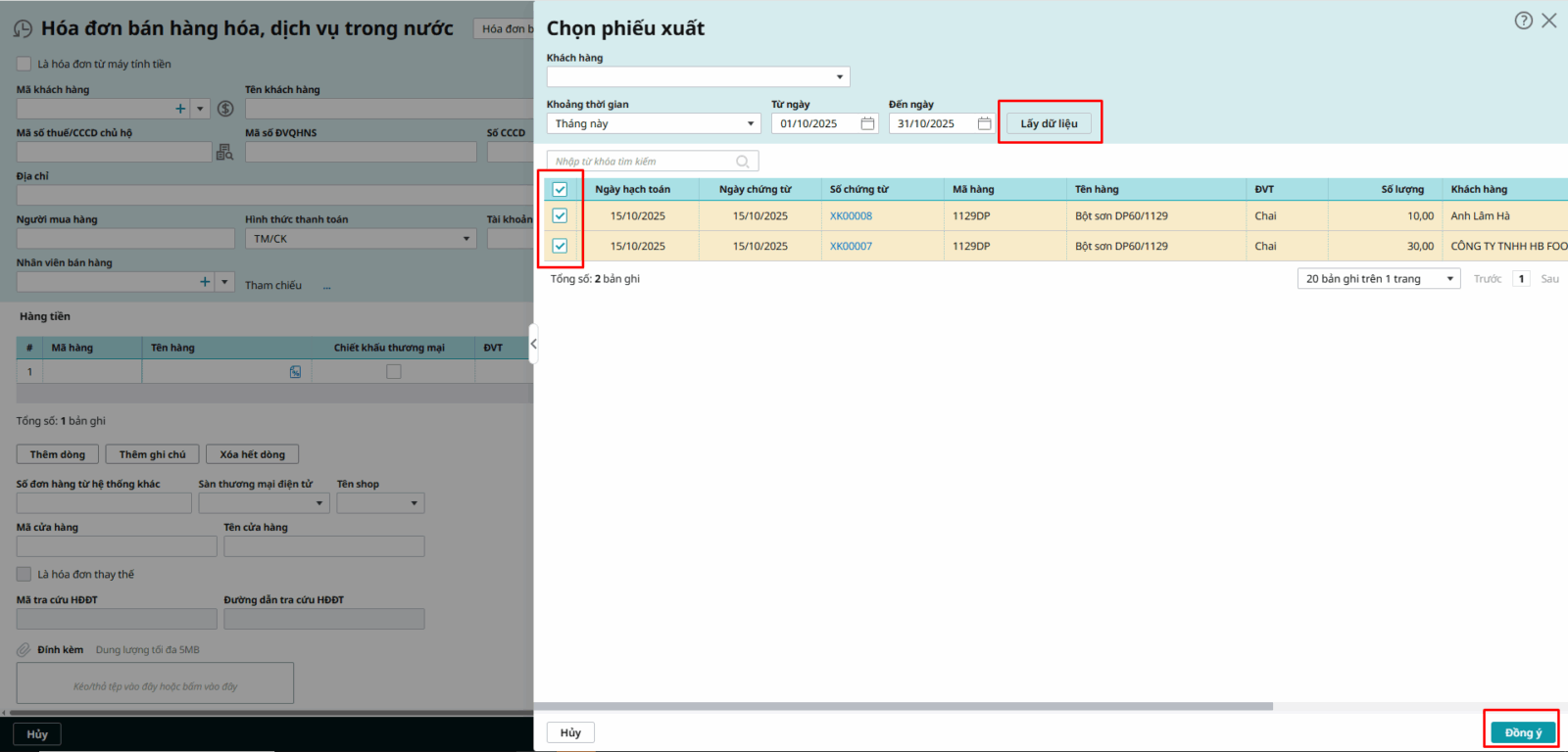 • Tích chọn các mặt hàng muốn đưa vào hóa đơn và nhấn Đồng ý.