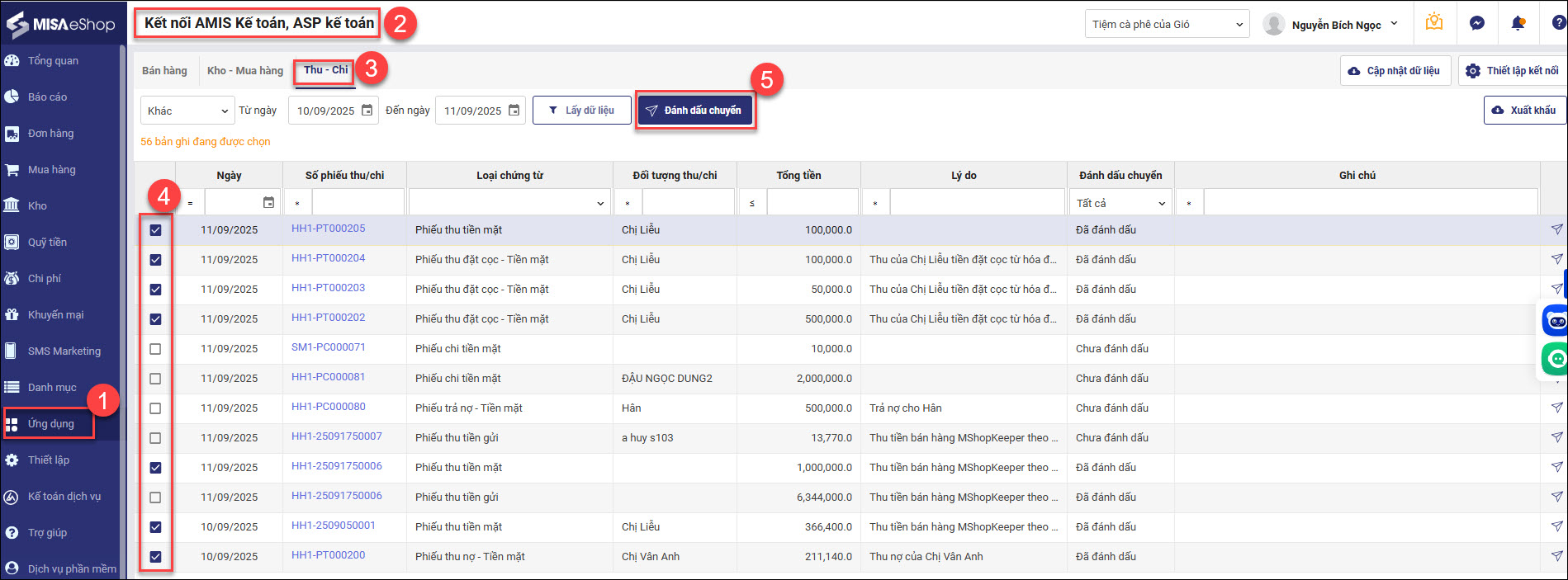 • Đánh dấu chuyển bên ESHOP: Vào Ứng dụng / kết nối AMIS kế toán, ASP kế toán / tab Thu – Chi / tích chọn các phiếu thu tiền mặt, phiếu thu nợ – tiền mặt, phiếu đặt cọc – tiền mặt / đánh dấu chuyển.