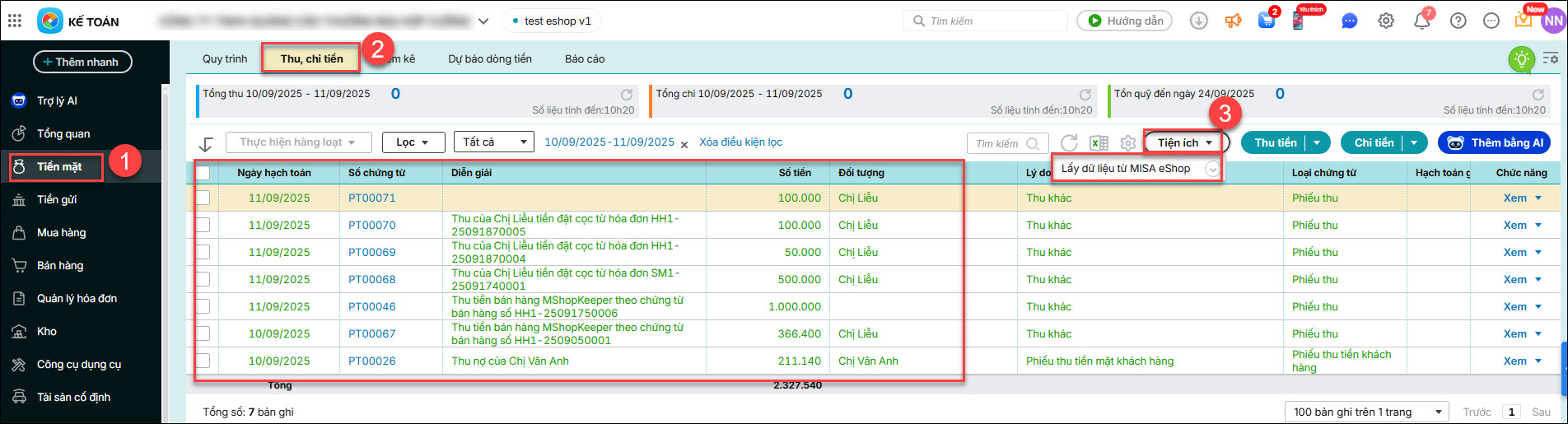 • Chứng từ lấy sang AMIS kế toán: Vào phân hệ Tiền mặt / tab Thu, chi tiền / Tiện ích: Lấy dữ liệu từ MISA ESHOP → các chứng từ này sẽ hiển thị ở phân hệ Tiền mặt, tab Thu, chi tiền, loại phiếu thu trên AMIS kế toán.