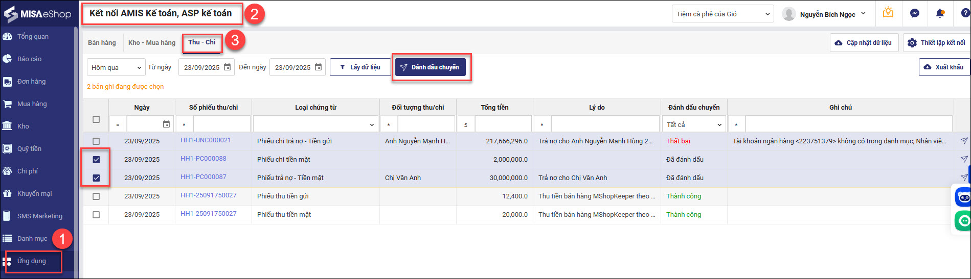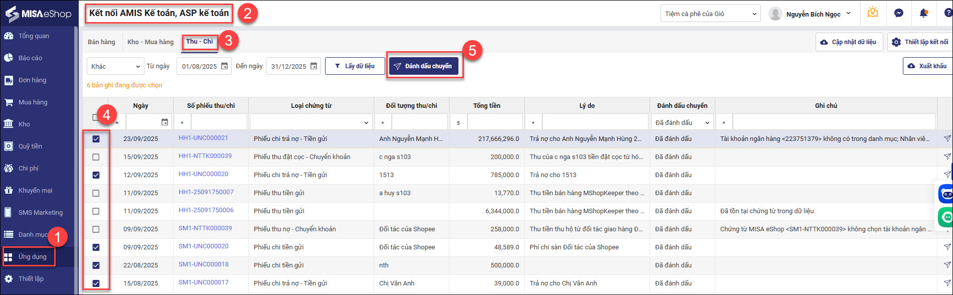 • Đánh dấu chuyển bên ESHOP: Vào Ứng dụng / kết nối AMIS kế toán, ASP kế toán / tab Thu – Chi / tích chọn các phiếu chi tiền gửi, phiếu chi trả nợ – tiền gửi, phiếu chi đặt cọc – tiền gửi, phiếu chi đặt cọc – chuyển khoản / đánh dấu chuyển.