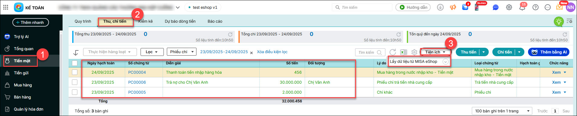 • Chứng từ lấy sang AMIS kế toán: Vào phân hệ Tiền mặt / tab Thu, chi tiền / Tiện ích: Lấy dữ liệu từ MISA ESHOP → các chứng từ này sẽ hiển thị ở phân hệ Tiền mặt, tab Thu, chi tiền, loại phiếu chi trên AMIS kế toán.