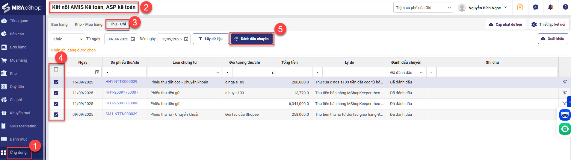• Đánh dấu chuyển bên ESHOP: Vào Ứng dụng / kết nối AMIS kế toán, ASP kế toán / tab Thu – Chi / tích chọn các phiếu thu tiền gửi, phiếu thu nợ – tiền gửi, phiếu thu nợ – chuyển khoản, phiếu thu đặt cọc – tiền gửi, phiếu thu đặt cọc – chuyển khoản / đánh dấu chuyển.