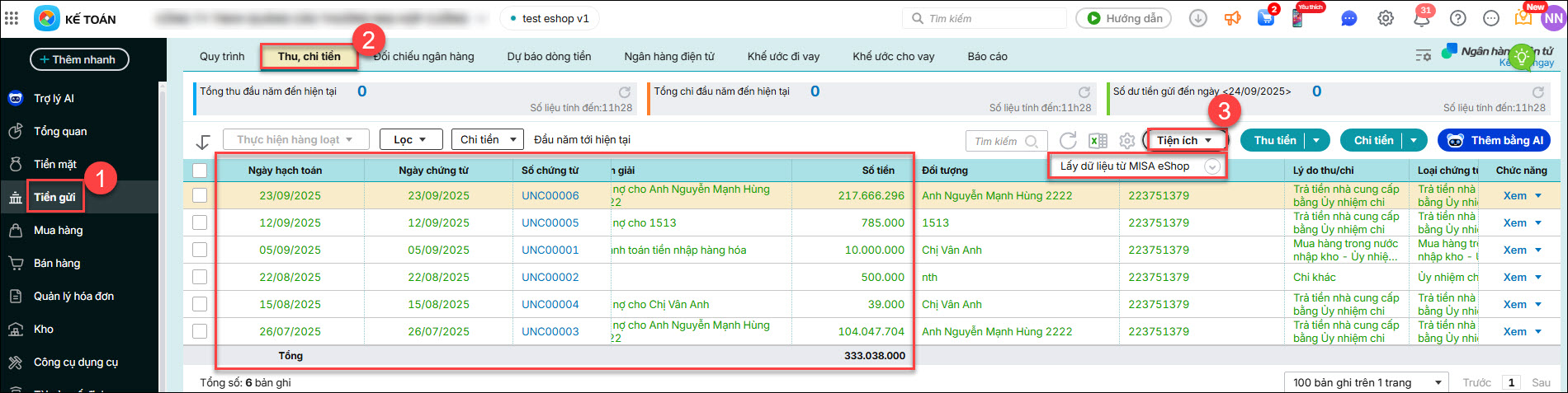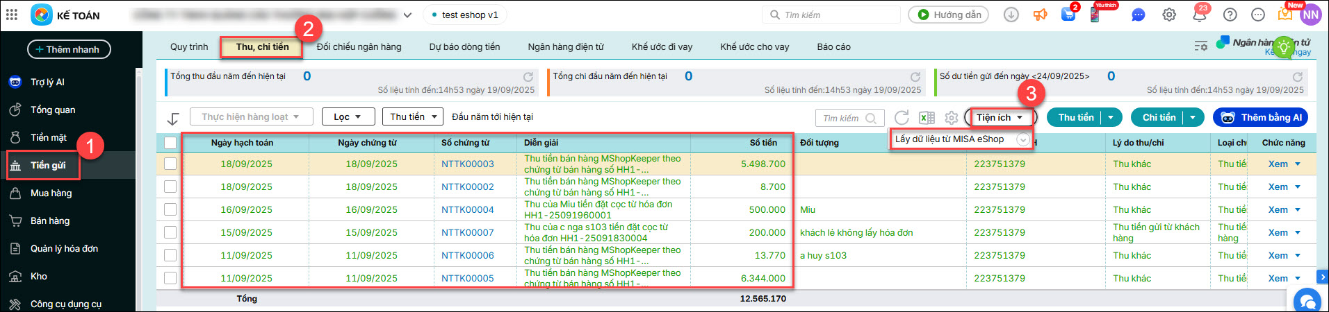• Chứng từ lấy sang AMIS kế toán: Vào phân hệ Tiền gửi / tab Thu, chi tiền / Tiện ích: Lấy dữ liệu từ MISA ESHOP → các chứng từ này sẽ hiển thị ở phân hệ Tiền gửi, tab Thu, chi tiền, loại phiếu thu tiền trên AMIS kế toán.