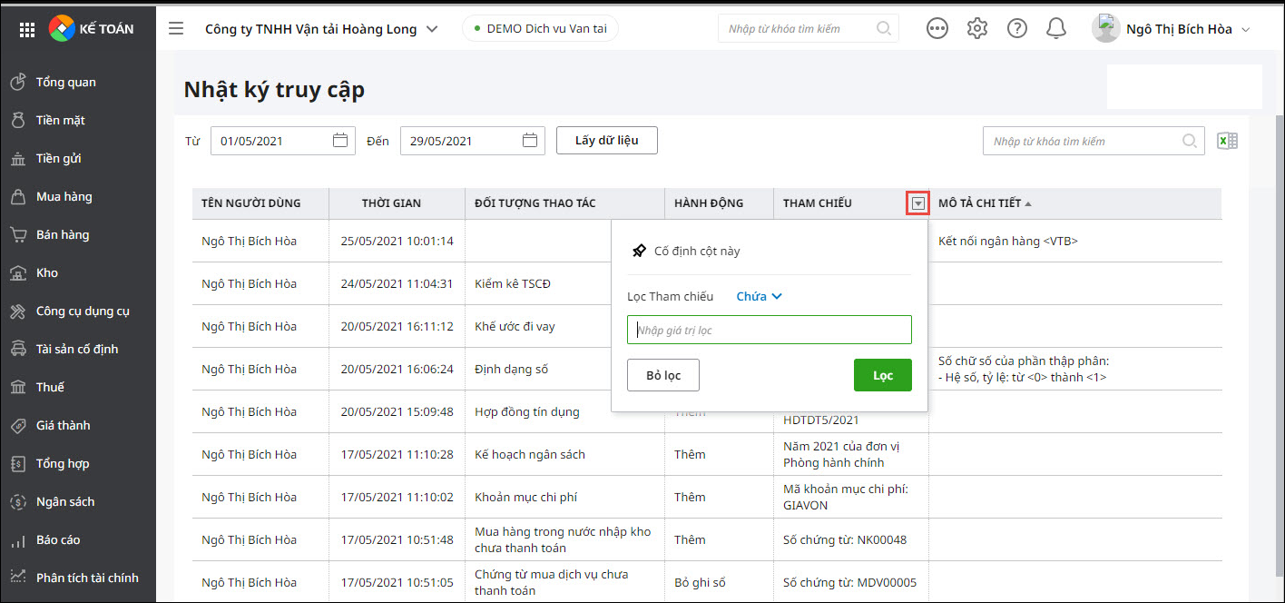 Từ phiên bản R19: Chương trình cho phép người dùng lọc theo từng cột trên Nhật ký truy cập: