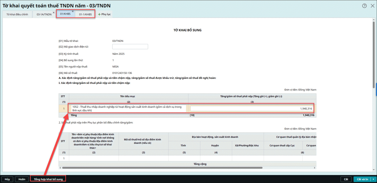 Ví dụ: Đơn vị cần lập tờ khai quyết toán thuế TNDN năm 2025, từ ngày 1/1/2025 đến ngày 31/12/2025. Khi kiểm tra ngày khóa sổ kỳ kế toán đang là 31/12/2025 -> Đơn vị cần thực hiện bỏ khóa sổ kỳ kế toán, đặt ngày khóa sổ mới về trước ngày 1/1/2025 (ví dụ 31/12/2024) sau đó lập lại tờ khai thuế TNDN Câu hỏi 3: Làm thế nào khi lập tờ khai quyết toán thuế TNDN bổ sung nhưng không hiển thị số thuế chênh lệch phải nộp ?Vấn đề: Khi doanh nghiệp lập tờ khai quyết toán thuế TNDN bổ sung, dù đã điều chỉnh số liệu nhưng không thấy hiển thị số tiền thuế chênh lệch phải nộp. Nguyên nhân: do chưa thực hiện bước Tổng hợp khai bổ sung, nên phần mềm chưa tính toán chênh lệch. Giải pháp: Sau khi lập tờ khai quyết toán thuế TNDN bổ sung và nhập lại số liệu đúng, anh/chị thực hiện nhấn nút “Tổng hợp khai bổ sung” trên tờ khai. Lưu ý: Nếu đã cất tờ khai bổ sung thì Anh chị nhấn sửa để hiển thị nút Tổng hợp khai bổ sung