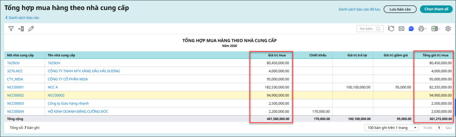 Trên báo cáo Tổng hợp mua hàng theo nhà cung cấp