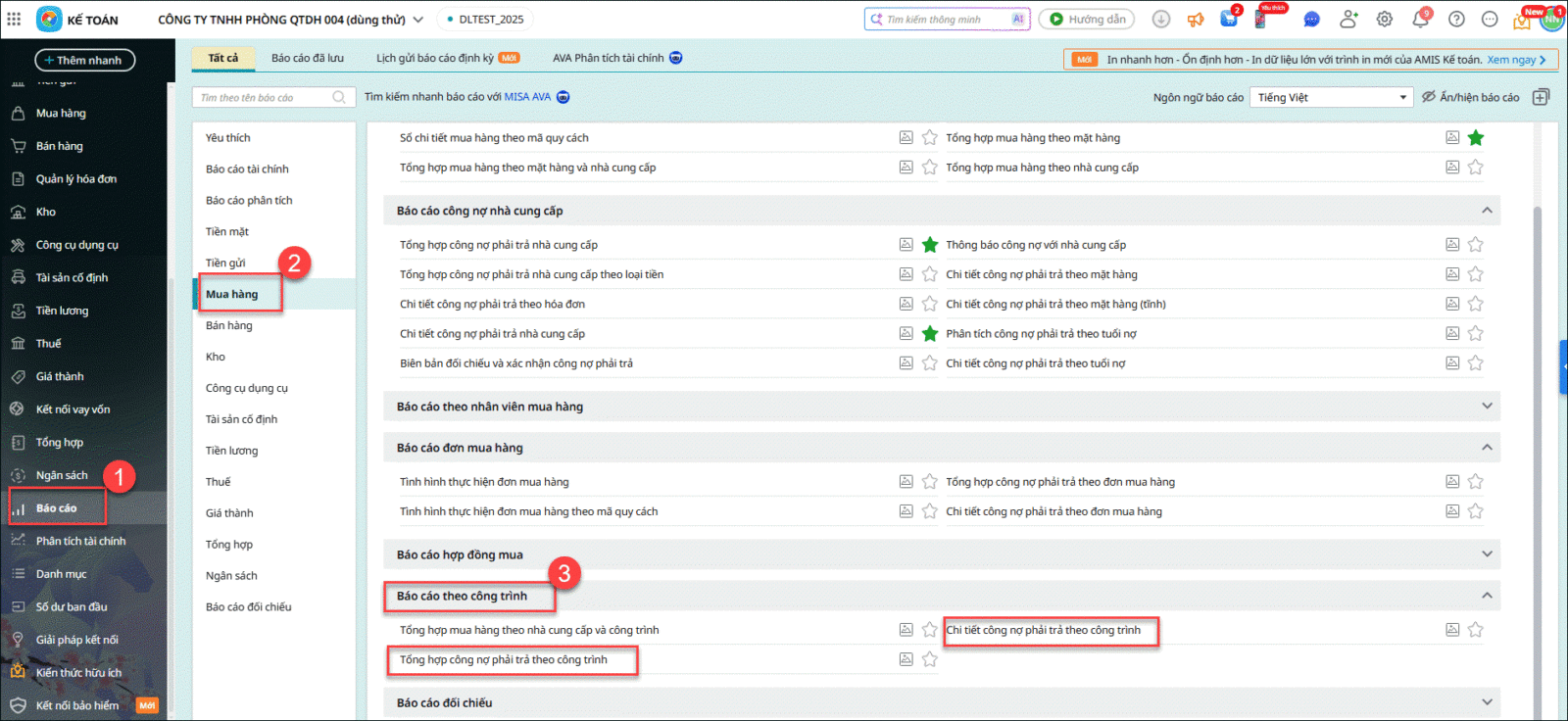 • Đối với công nợ phải trả: Vào Báo cáo \ Mua hàng \ Báo cáo theo công trình \ Tổng hợp công nợ phải trả theo công trình hoặc Chi tiết công nợ phải trả theo công trình