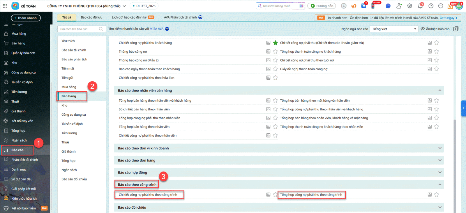 Để xem báo cáo công nợ có thêm cột công trình Anh chị thực hiện như sau