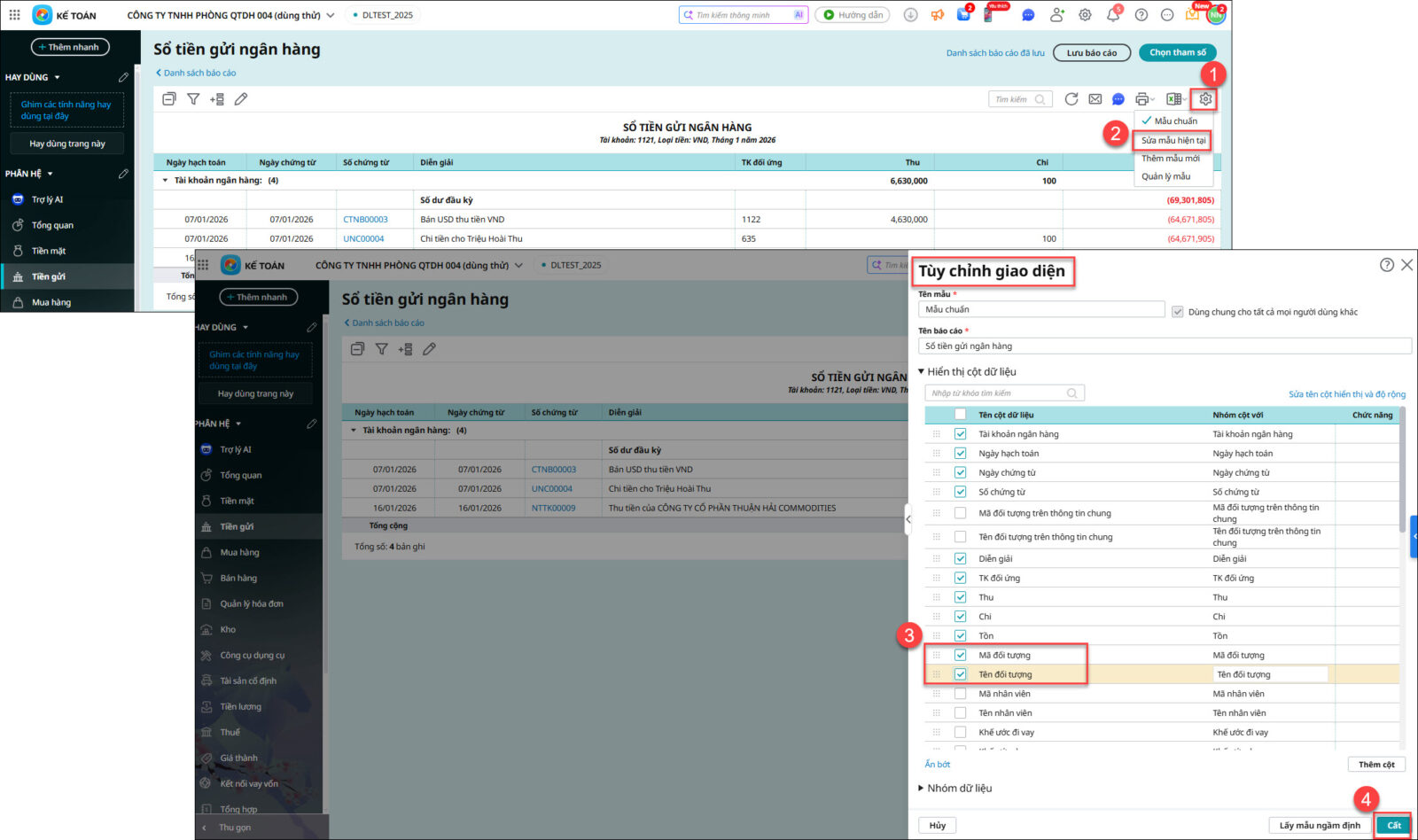 Bước 3: Nhấn vào biểu tượng bánh răng Tùy chỉnh mẫu báo cáo / Sửa mẫu hiện tại / Nhấn Hiển thị thêm, tích chọn cột Mã đối tượng, Tên đối tượng