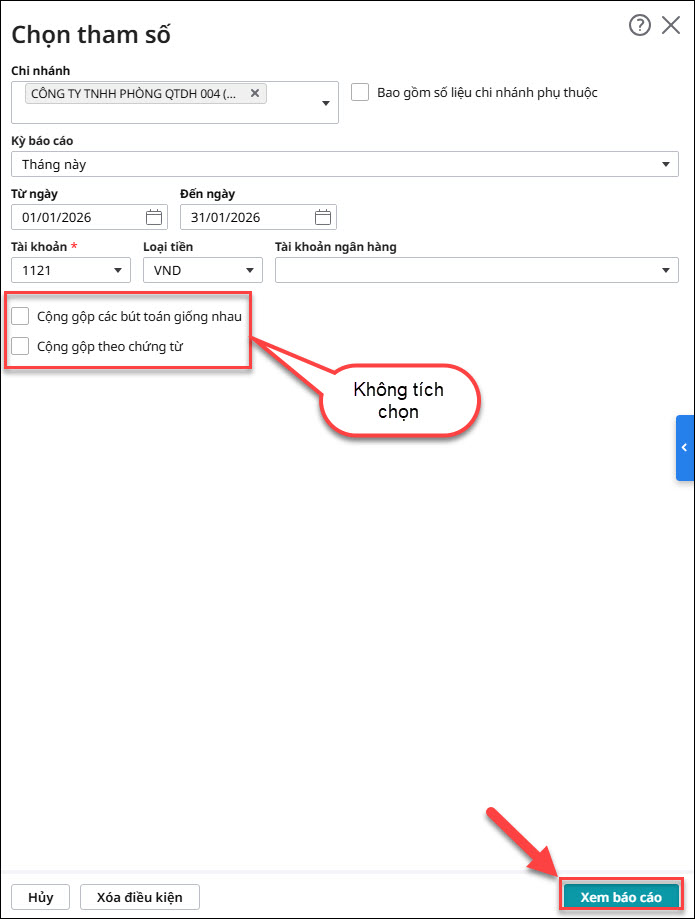 Câu hỏi 1: Xuất sổ chi tiết tài khoản 1121 theo từng tài khoản ngân hàng?Anh/chị muốn xem hoặc xuất sổ chi tiết tài khoản 1121 theo từng tài khoản ngân hàng cụ thể (hoặc toàn bộ các tài khoản ngân hàng) để đối chiếu và theo dõi phát sinh.h. Giải pháp: Để xem sổ chi tiết tài khoản 1121 theo từng tài khoản ngân hàng, thực hiện như sau: