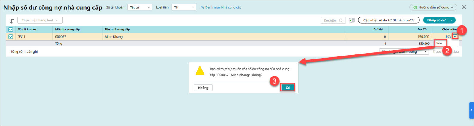 Câu hỏi 2: Muốn xóa số dư đầu kỳ ở công nợ nhà cung cấp nhưng không xóa được thì phải làm thế nào?