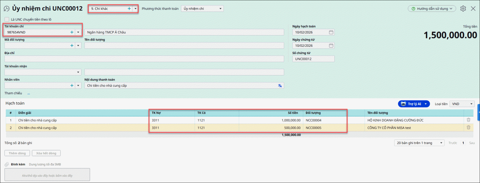 • Chọn loại Chi khác, sau đó hạch toán Nợ TK 331 / Có TK 112 (hoặc TK 111) từng dòng tương ứng số tiền cần trả cho từng nhà cung cấp. Tại cột đối tượng, chọn mã nhà cung cấp tương ứng