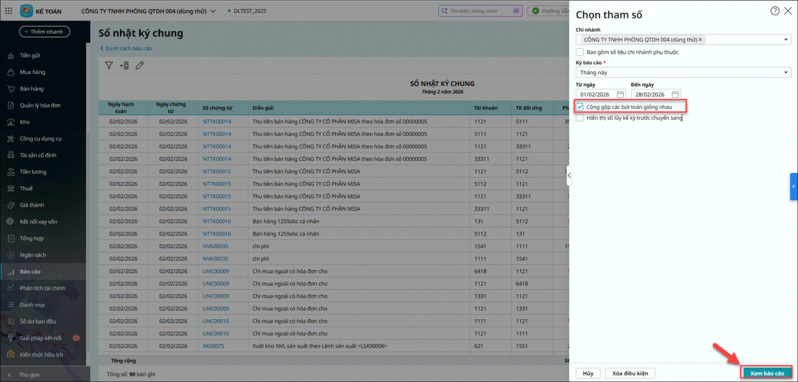 Bước 2: Chọn tham số xem báo cáo, tích chọn Cộng gộp các bút toán giống nhau
