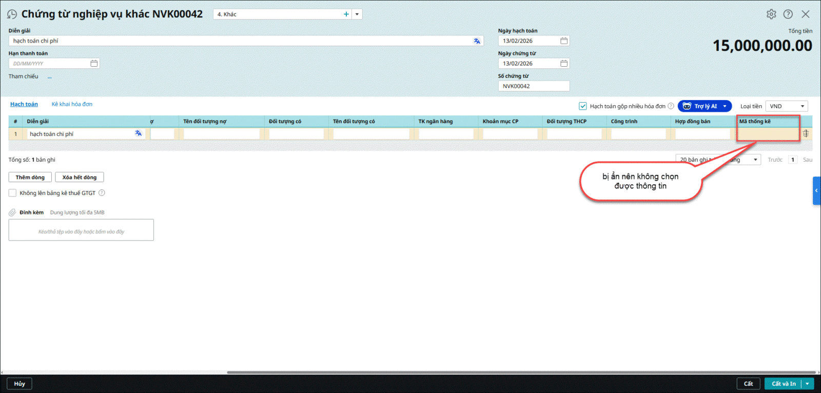 • Tab Hạch toán: Điền thông tin hạch toán nghiệp vụ (không điền hạch toán thuế)