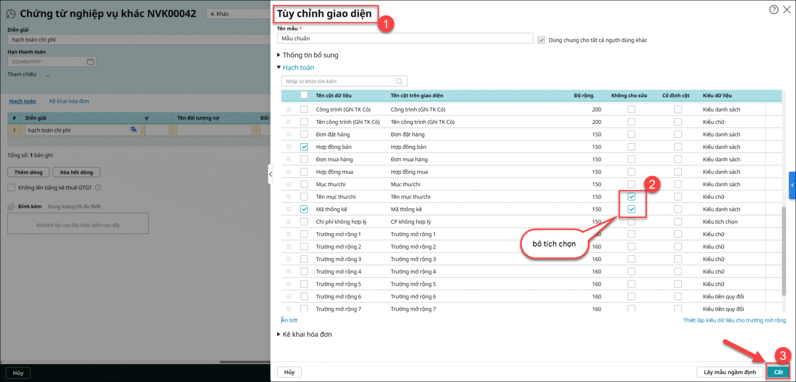 • Bước 2: Trên bảng Tùy chỉnh giao diện, nhấn Hiển thị thêm \ kéo đến dòng có Tên cột dữ liệu đang bị ẩn \ bỏ tích chọn cột Không cho sửa