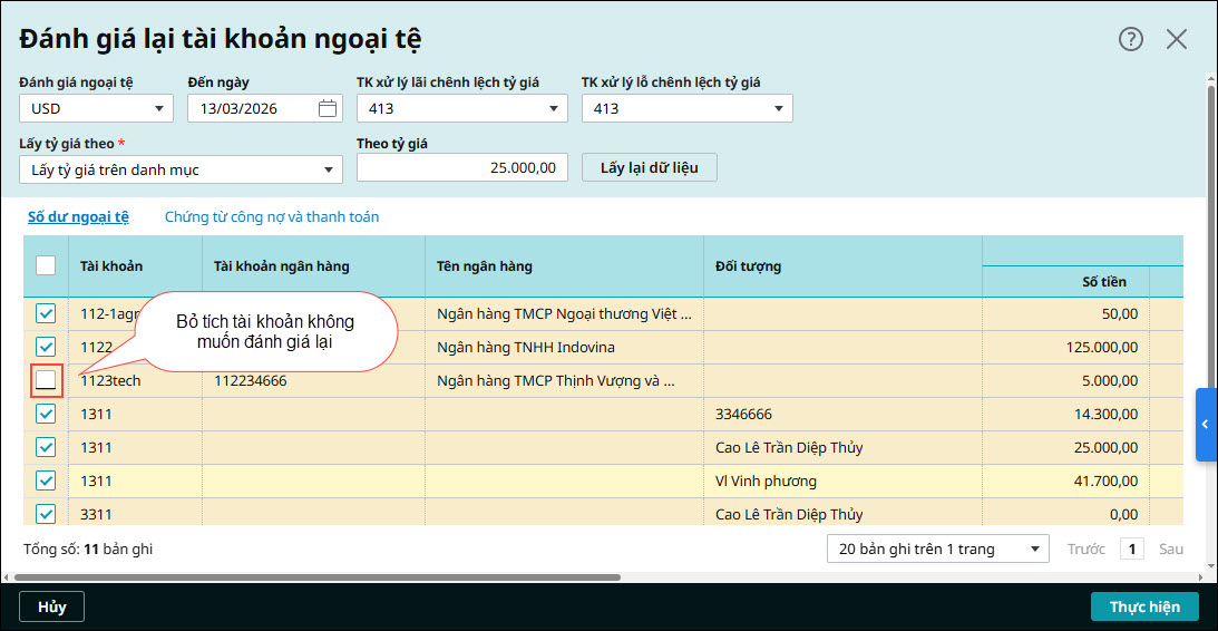 Trường hợp 1: Không muốn đánh giá lại ngoại tệ cho tài khoản trong chứng từ đánh giá lại => Tại danh sách tài khoản trên chứng từ đánh giá lại tài khoản ngoại tệ, bỏ tích chọn dòng tài khoản không cần đánh giá lại.
