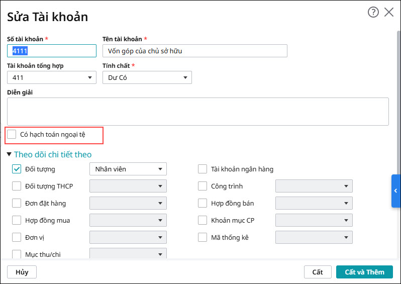 • Tại dòng tài khoản bị lỗi (ví dụ TK 411), nhấn Sửa tại cột Chức năng -> tích chọn Có hạch toán ngoại tệ -> nhấn Cất