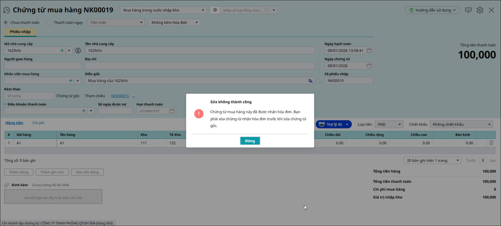 Khi xóa (hoặc sửa) chứng từ mua hàng, mua dịch vụ báo lỗi “Chứng từ mua dịch vụ (mua hàng) này đã được nhận hóa đơn”, Anh chị xử lý như sau