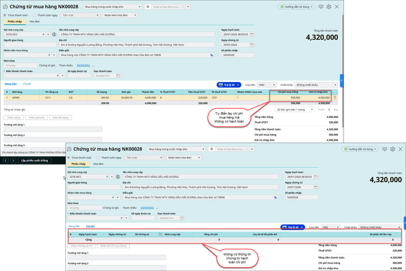 Nguyên nhân: Do đơn vị tự gõ tay số tiền chi phí vào cột Chi phí mua hàng ở chứng từ mua hàng mà không có thêm dòng hạch toán chi phí hoặc chứng từ mua dịch vụ hạch toán chi phí
