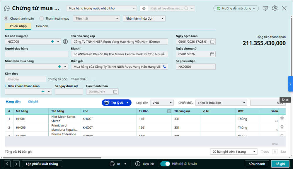 • Nhập kho theo số lượng thực nhập