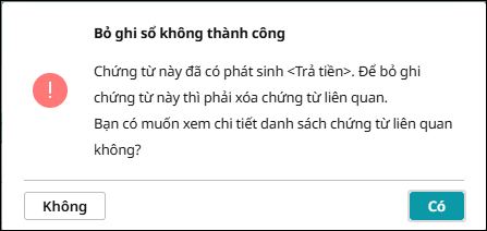 “Chứng từ này đã có phát sinh <Trả tiền>. Để bỏ ghi chứng từ này thì phải xóa chứng từ liên quan…”