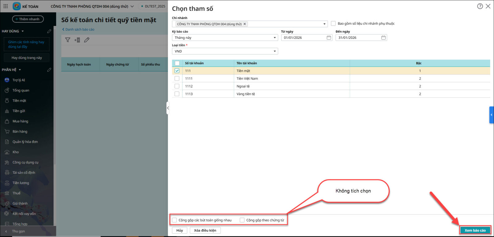 Bước 2: Chọn tham số \ Xem báo cáo: không tích chọn Cộng gộp các bút toán giống nhau và Cộng gộp theo chứng từ