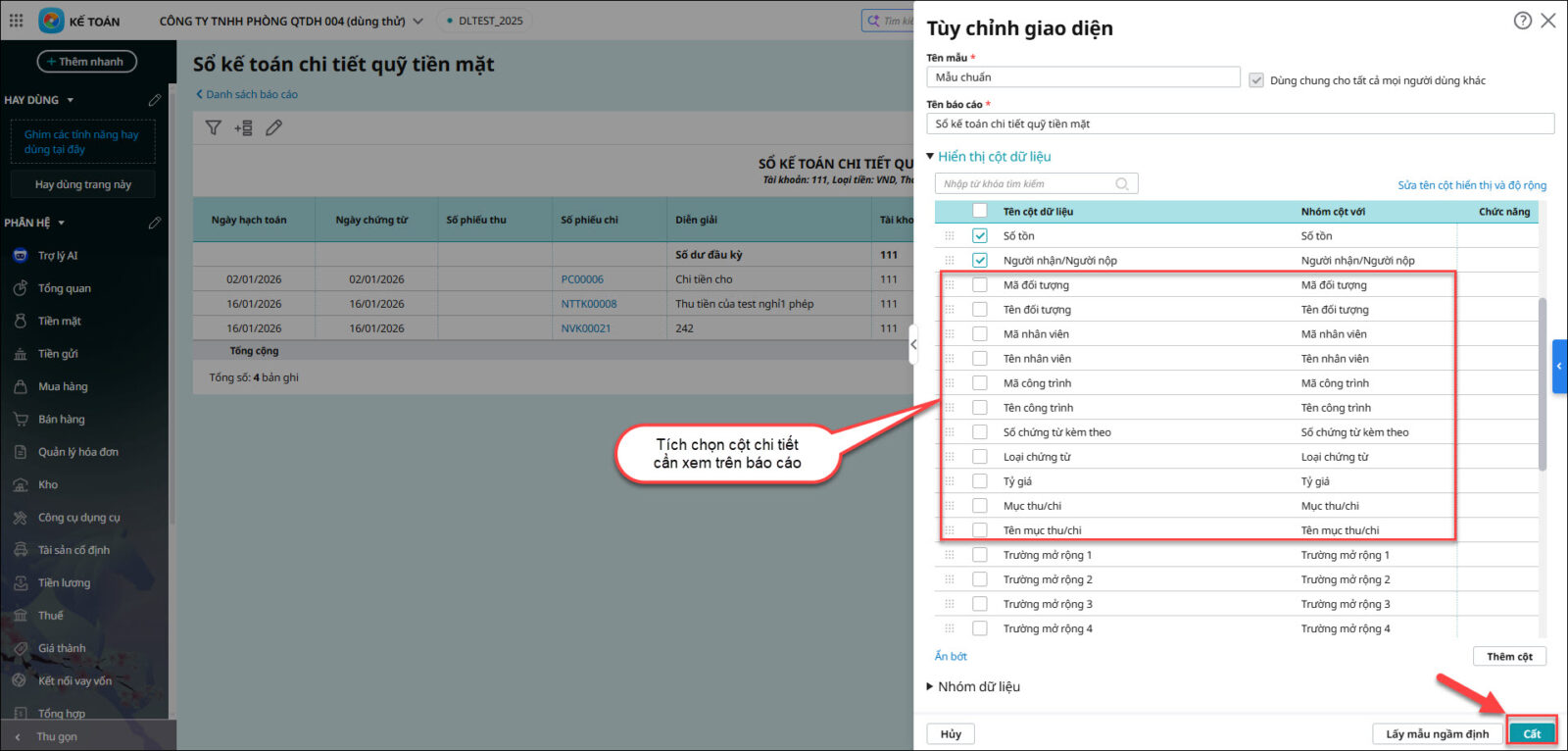 Biểu hiện: Cần xem sổ chi tiết tài khoản 111 (tiền mặt) có hiển thị các thông tin chi tiết như đối tượng, công trình, nhân viên, mục thu chi…. kèm theo, nhưng trên báo cáo mặc định chưa thấy thông tin này.