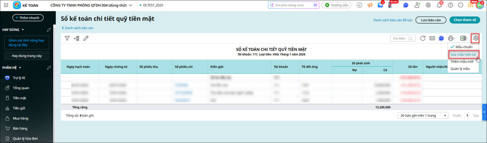 Bước 1: Vào phân hệ Tiền mặt / Báo cáo / Sổ kế toán chi tiết quỹ tiền mặt