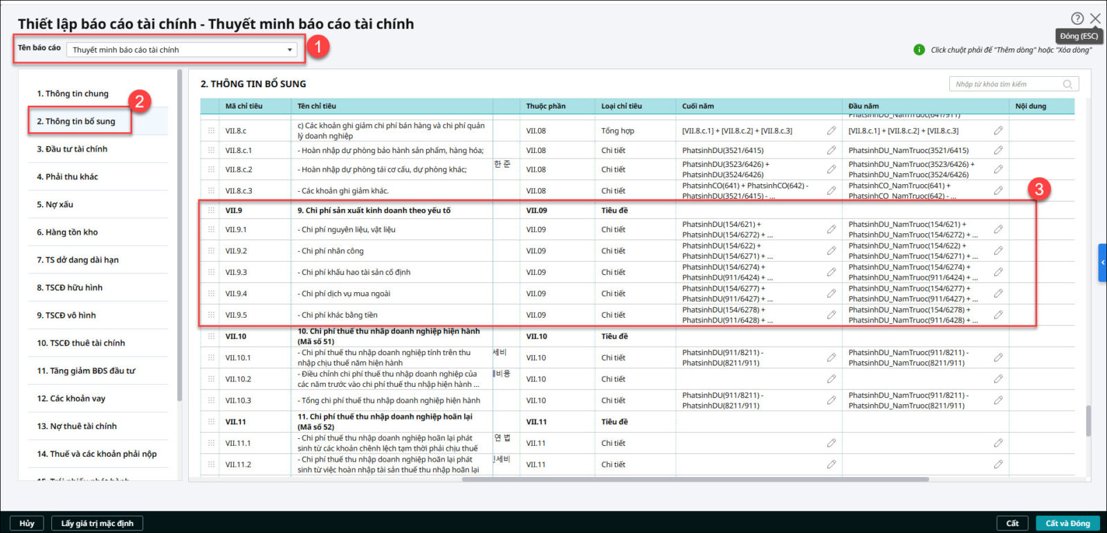 Bước 2: Tại dòng Tên báo cáo, nhấn biểu tượng ∇ chọn Thuyết minh báo cáo tài chính Bước 3: Vào mục 2. Thông tin bổ sung, kéo thanh cuộn xuống mục VII.9 Chi phí sản xuất kinh doanh theo yếu tố, sau đó Anh chị xem công thức tại cột Đầu năm, Cuối năm