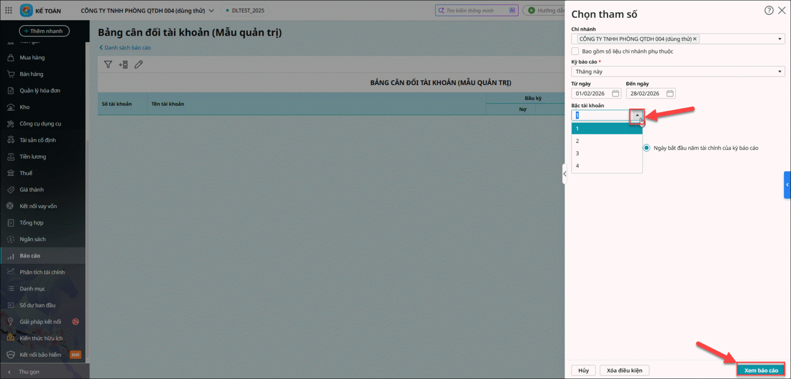 Bước 3: Vào Bảng cân đối tài khoản, nạp lại. Câu hỏi 7: Trên Bảng cân đối tài khoản làm thế nào để xem báo cáo theo tài khoản mẹ hoặc chi tiết đến tài khoản con ?Để xem Bảng cân đối tài khoản theo tài khoản mẹ hoặc chi tiết đến tài khoản con, Anh chị thực hiện như sau: