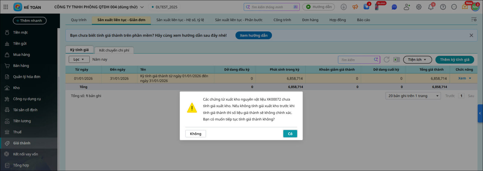 Câu hỏi 1: Khi tính giá thành hiển thị cảnh báo <Các chứng từ xuất kho nguyên vật liệu ..... chưa tính giá xuất kho. Nếu không tính giá xuất kho trước khi tính giá thành thì số liệu giá thành sẽ không chính xác. Bạn có muốn tiếp tục tính giá thành không?>
