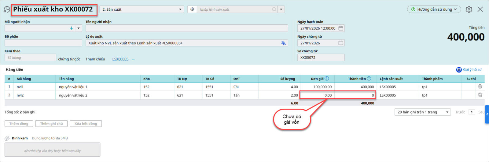 Nguyên nhân: Do trên phiếu xuất kho nguyên vật liệu có dòng vật tư hàng hóa chưa có giá vốn