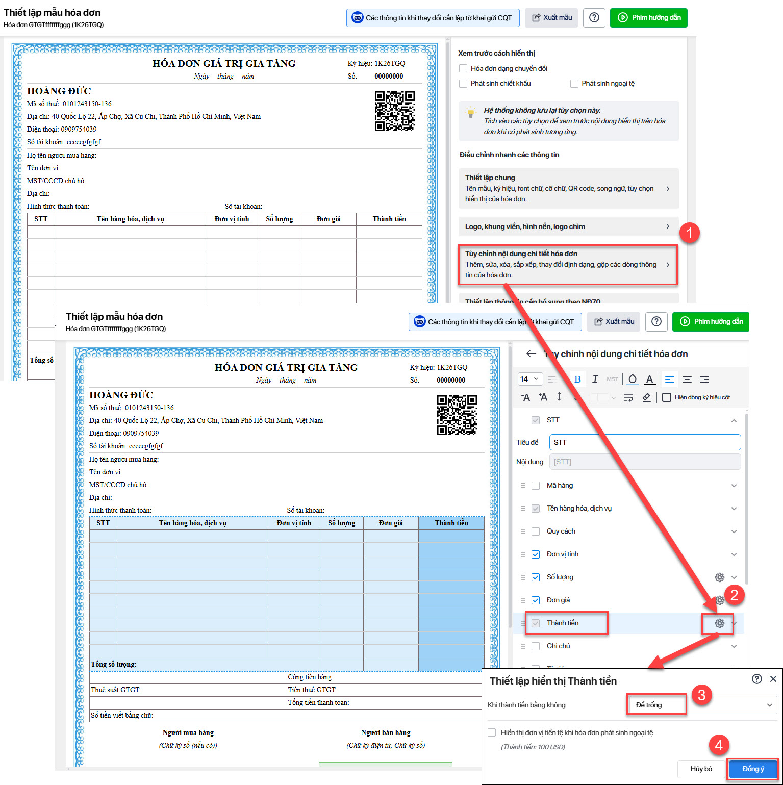Bước 3: Tại bước Tùy chỉnh nội dung chi tiết hóa đơn, tùy chỉnh thông tin Thành tiền. Nhấn biểu tượng bánh răng tại dòng Thành tiền để thiết lập cách hiển thị thành tiền: tại dòng Khi thành tiền bằng không chọn Để trống -> nhấn Đồng ý