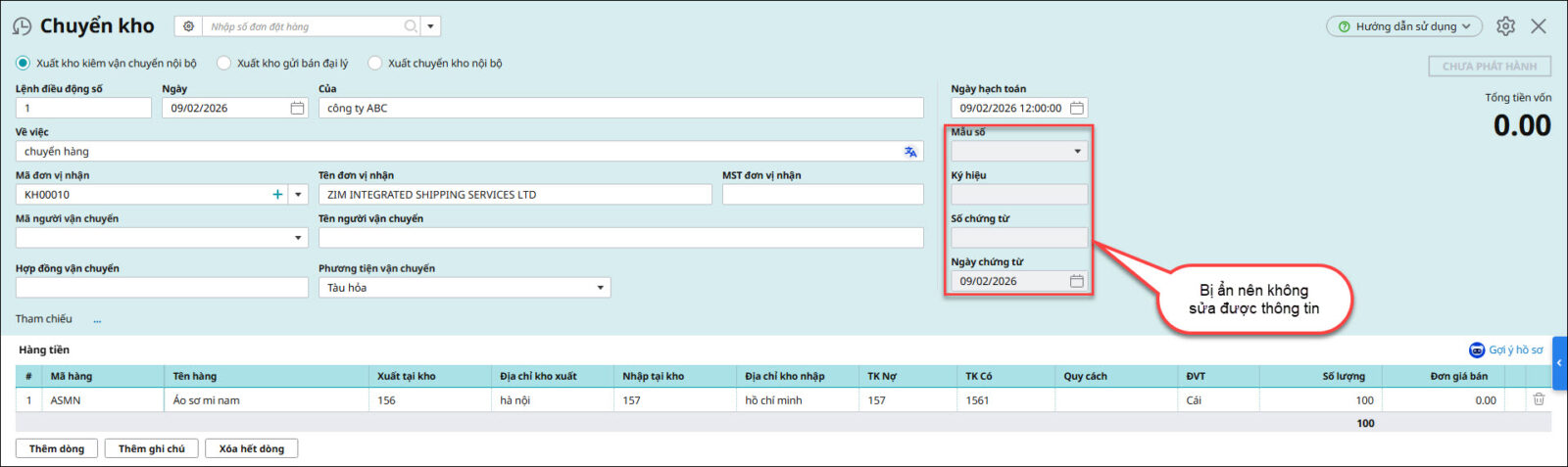 Câu hỏi 21: Tại sao tôi không sửa được thông tin ngày chứng từ, số chứng từ trên phiếu xuất kho kiêm vận chuyển nội bộ (hoặc phiếu xuất kho gửi bán đại lý) ?Biểu hiện: Trên chứng từ xuất kho kiêm vận chuyển nội bộ (hoặc phiếu xuất kho gửi bán đại lý), các thông tin số chứng từ, ngày chứng từ bị ẩn, không sửa được