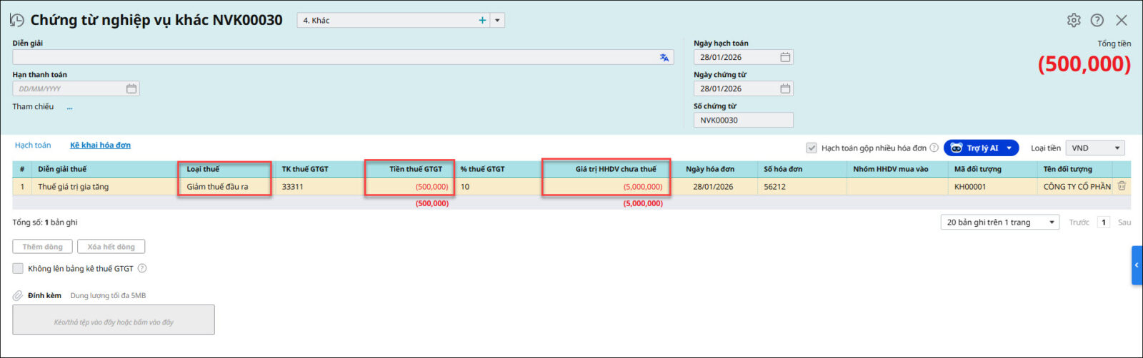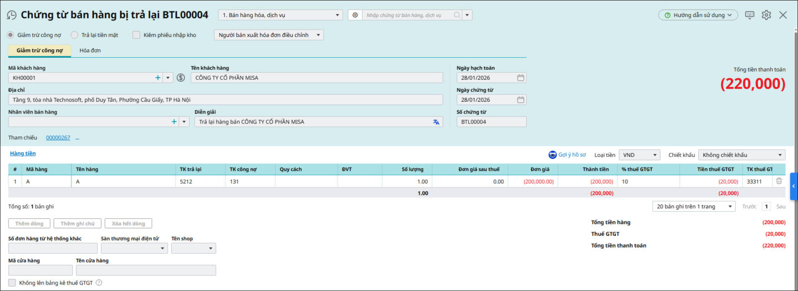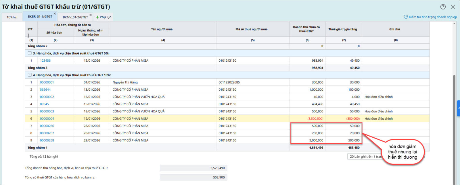 Nguyên nhân: Do đơn vị hạch toán giảm thuế GTGT đầu ra ở Chứng từ nghiệp vụ khác hoặc chứng từ Giảm giá hàng bán và Trả lại hàng bán nhưng lại điền số tiền âm