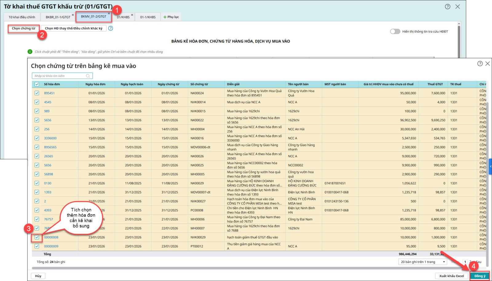 Câu hỏi 9: Tôi đang lập tờ khai bổ sung của kỳ bị kê khai sót hóa đơn đầu vào nhưng sao bảng kê mua vào trên tờ khai bổ sung không thấy lên hóa đơn bị thiếu đó ?Trả lời: