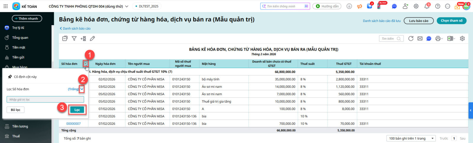 Câu hỏi 12: Trên bảng kê hóa đơn HHDV bán ra mẫu quản trị đang lên cả những hóa đơn chưa phát hành (chưa có số hóa đơn) thì làm thế nào để loại những hóa đơn này ra ?Để loại các hóa đơn chưa phát hành (chưa có số hóa đơn) ra khỏi Bảng kê hóa đơn HHDV bán ra mẫu quản trị Anh chị thực hiện như sau Bước 1: Vào Báo cáo \ Thuế \ Bảng kê hóa đơn, chứng từ hàng hóa, dịch vụ bán ra (Mẫu quản trị) Bước 2: Chọn tham số mở báo cáo Bước 3: Nhấn biểu tượng ∇ ở tiêu đề cột Số hóa đơn \ nhấn ∨ chọn điều kiện lọc là Trống \ nhấn Lọc Khi đó trên bảng kê hóa đơn HHDV bán ra (mẫu quản trị) sẽ chỉ thể hiện các hóa đơn đã phát hành (có số hóa đơn)