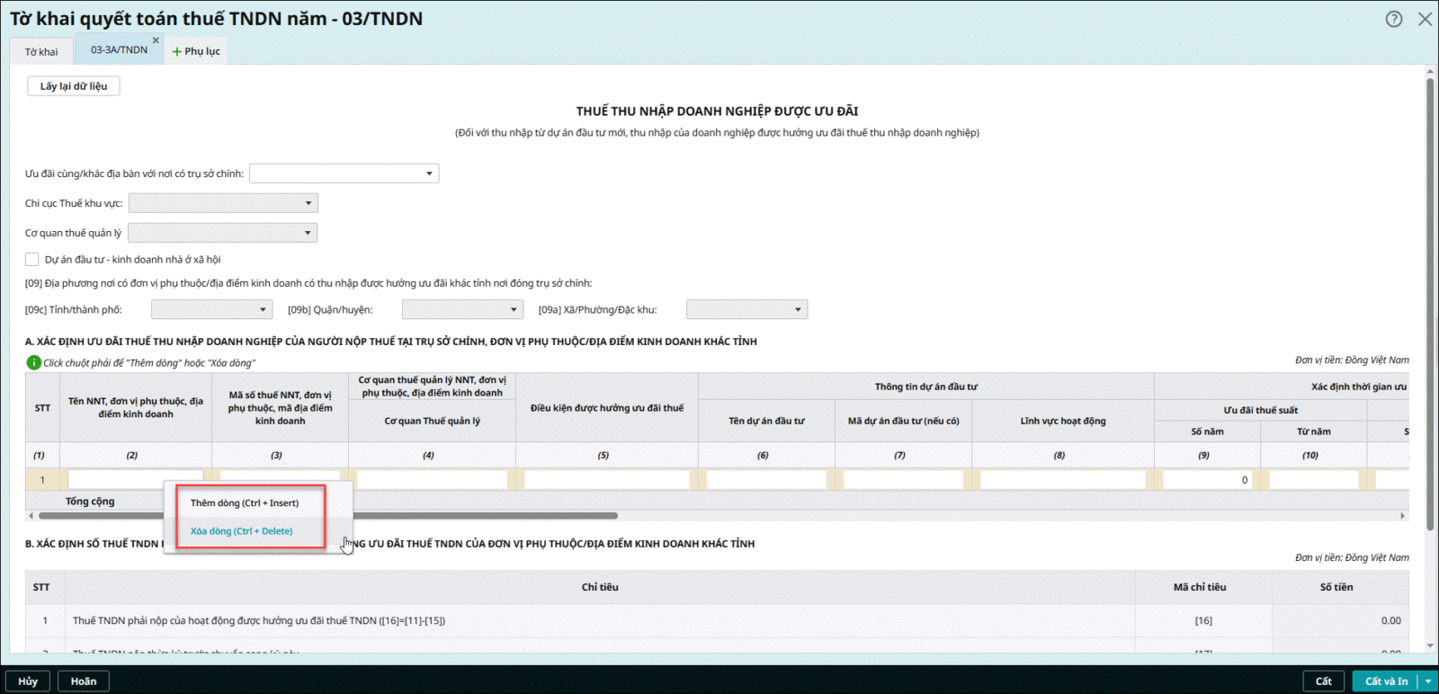 Câu hỏi 13: Trên các phụ lục của tờ khai thuế, tôi muốn thêm dòng để tự điền số liệu hoặc xóa dòng thì làm thế nào ?
