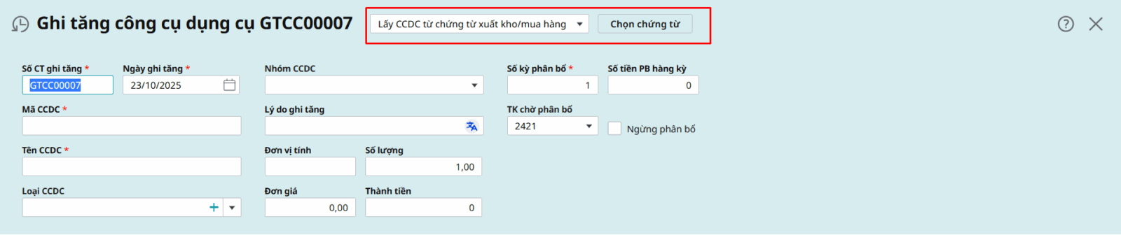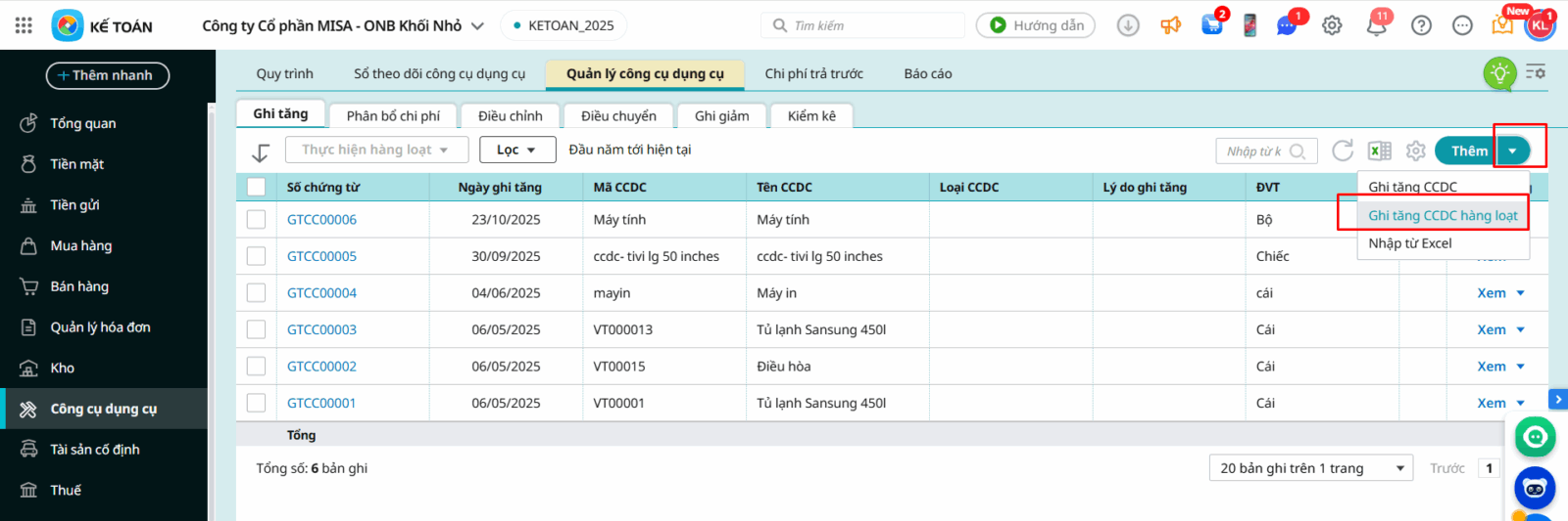 - Nếu mua nhiều CCDC và muốn ghi tăng cùng 1 lúc nhiều CCDC, có thể sử dụng chức năng Ghi tăng CCDC hàng loạt.
