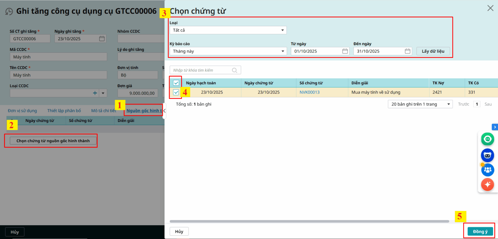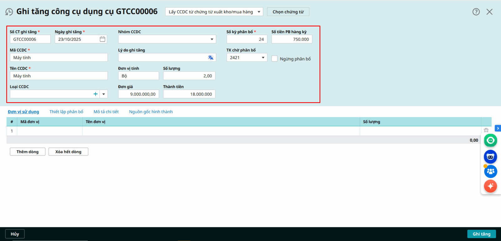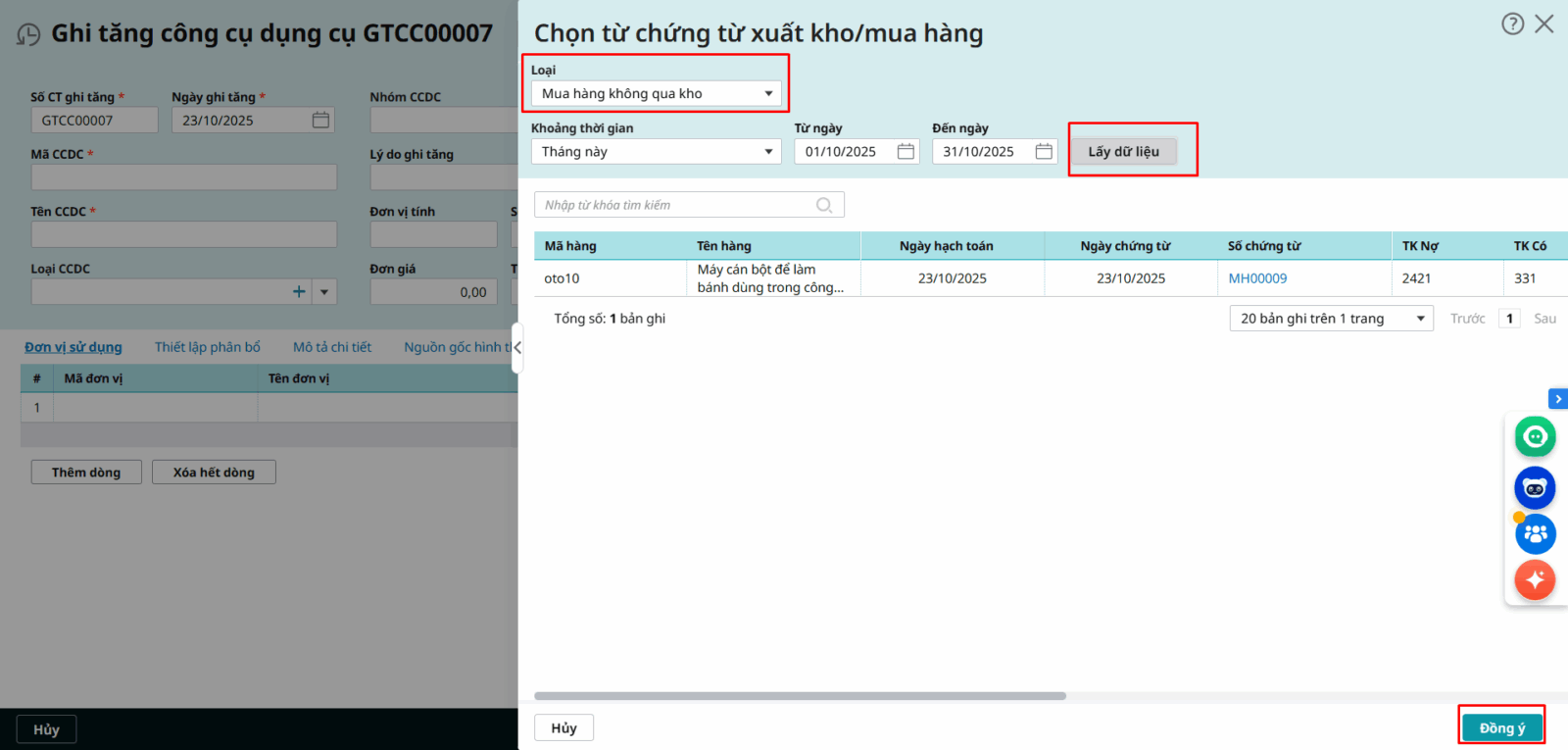 - Sau đó thực hiện Ghi tăng CCDC, Ghi tăng TSCĐ chọn đến chứng từ hạch toán, phần mềm sẽ lấy số liệu theo từng dòng hạch toán tương ứng
