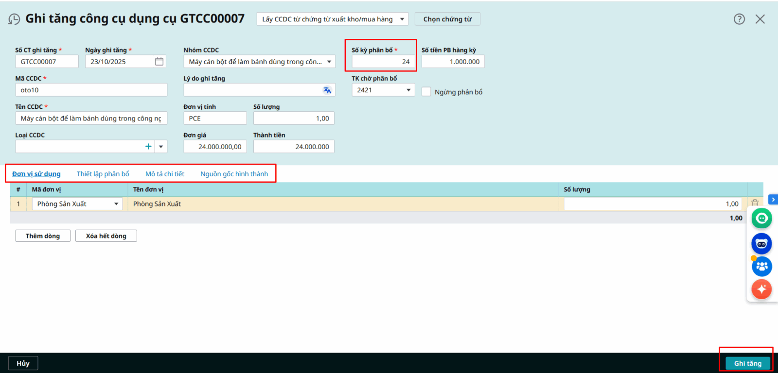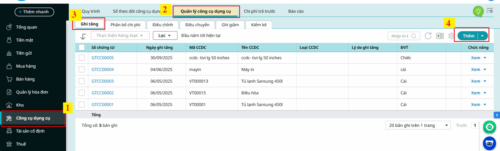 Bước 2: Ghi tăng CCDC vào sổ theo dõi CCDC