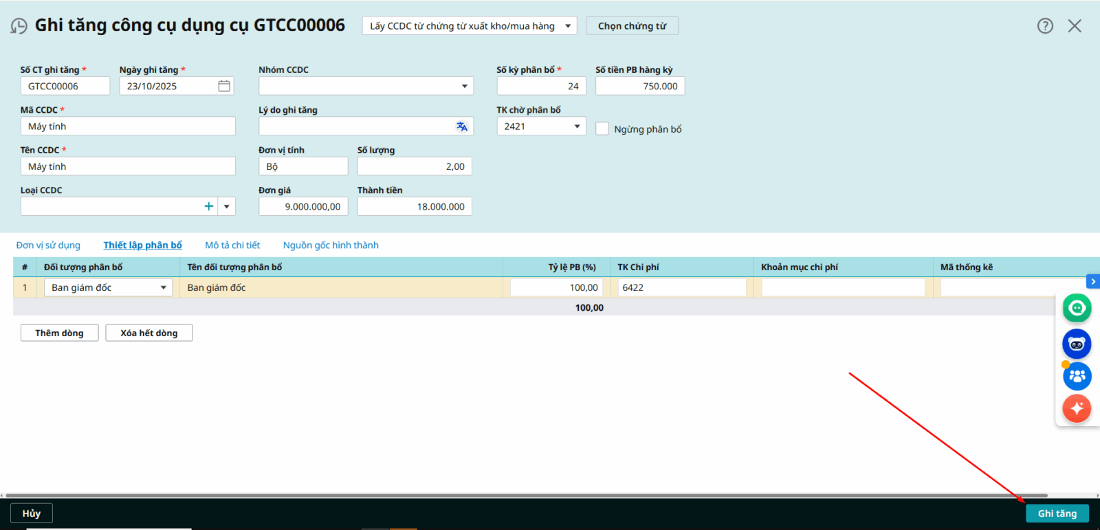 Bài viết hướng dẫn cách hạch toán và ghi tăng công cụ, dụng cụ (CCDC) mua về đưa vào sử dụng ngay trên phần mềm, giúp doanh nghiệp ghi nhận, phân bổ và quản lý chi phí CCDC chính xác.